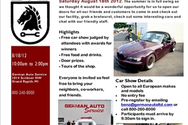 Don't miss our annual Car Show and Open House August 17th! schedule Thursday, March 28, 2013 On behalf of German Auto Service I would like to invite you to our 5th annual open house and car show. The event will take place on Saturday August 17th 2013 from 10:00am to 2:00pm at our Grand Rapids... Read more