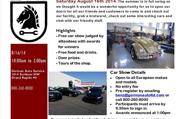 Open House and Car Show 2014! schedule Wednesday, April 23, 2014 On behalf of German Auto Service I would like to invite you to our 6th annual open house and car show. The event will take place on Saturday August 16th 2014 from 10:00am to 2:00pm at our Grand Rapids... Read more